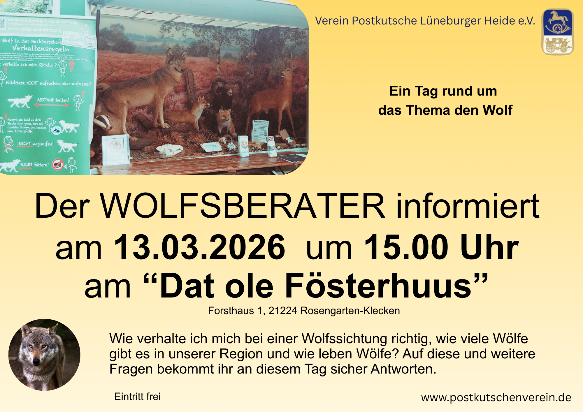 Der Wolf ist in Deutschland zurück. Für den Arterhalt und die Natur eine positive Entwicklung, für uns Menschen jedoch eine gefühlte Bedrohung. Der Wolfsberater Bernard Wegner klärt über den Umgang und die Population der Wölfe in unserer Region auf. Ein Informationstag für die ganze Familie!